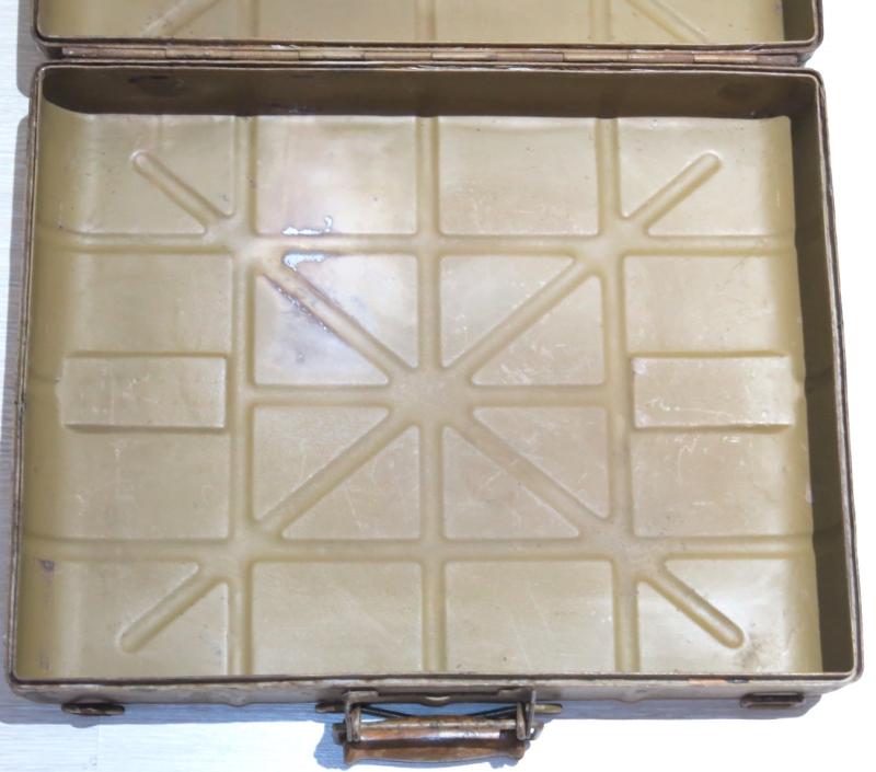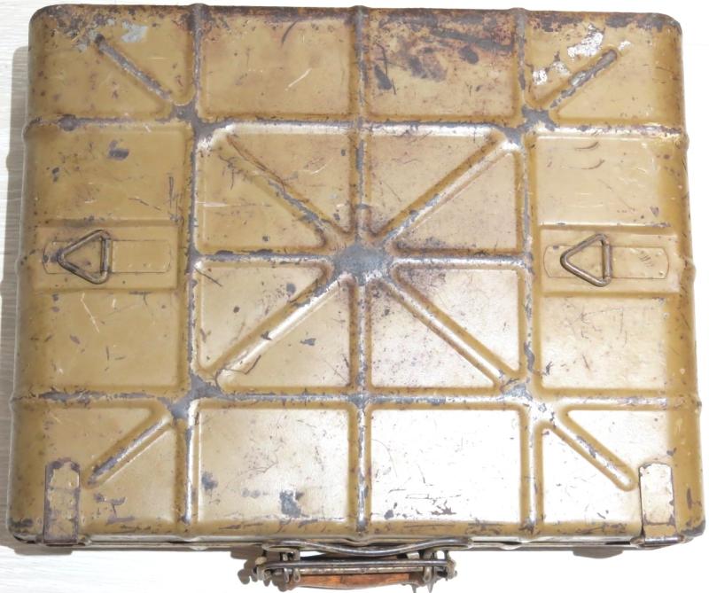 This is one of the hardest to find boxes, metal cases, (In Feldgrau), for Egg Grenades have been always hard to find, already 25 years ago. But a real DAK dated one in sand colour für Tropen..... It is a Top Shelf box, one of a kind. Condition is wonderful, only has one fin from the closing system that got broken, but it is totally fixable, (If you want to fix it), very easy with, for example, a MIG welder. I have made some photos for you can see it is not a big deal, even if you leave it like this, it will not affect the display, as you can see at the first photo. It is only the second time in my life that I have a box like this.