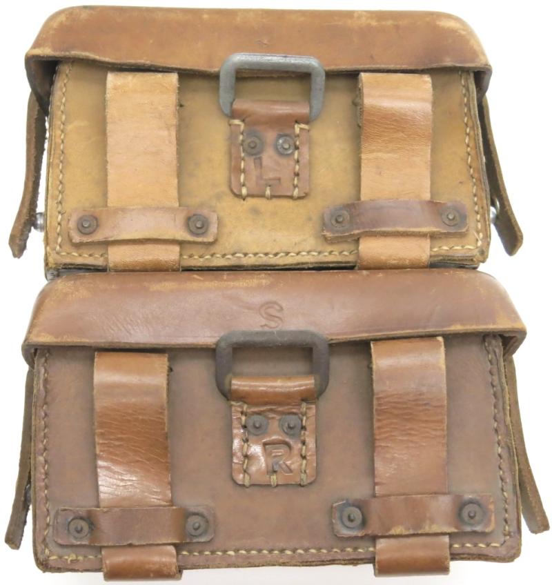 You can find one pouch here and there from different makers, years, or unmarked, Left or Right Pouch... But here we have an original set of pouches. Late war made used all mixed material, aluminium knobs with steel washers, steel knobs in one pouch and on the other aluminium.... Typical late war stuff. And as typical with late war medical pouches, no contents label inside, never been there. On one pouch you can see a mark from something that was stored inside, but no remains of glue anywhere. You can buy a repro set of labels if you want, (Just search on Google), or leave them in their original condition. Condition is nearly mint, maybe never used. The left pouch came with those dressings inside, so I leave them there, they are good for keep the shape.