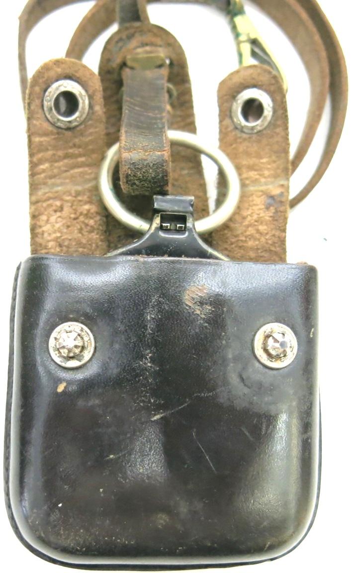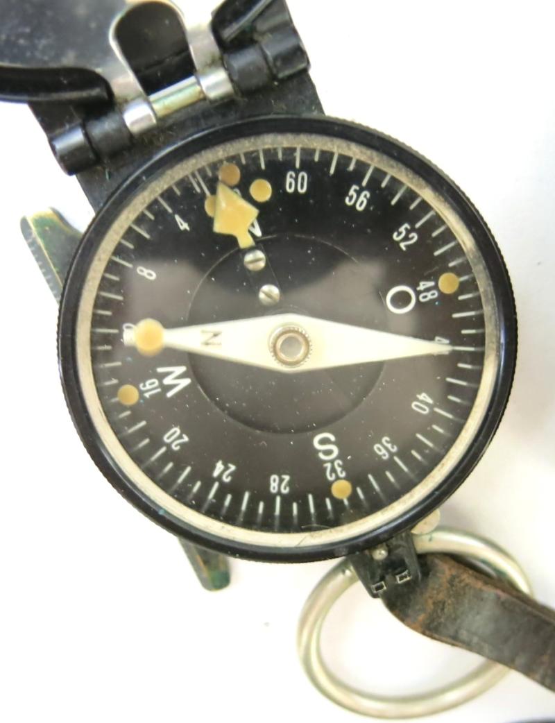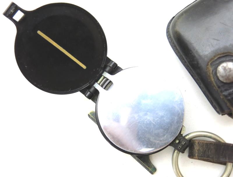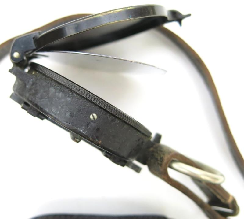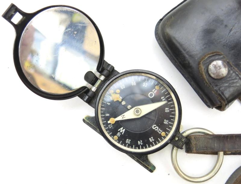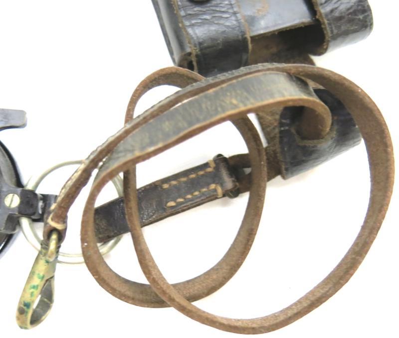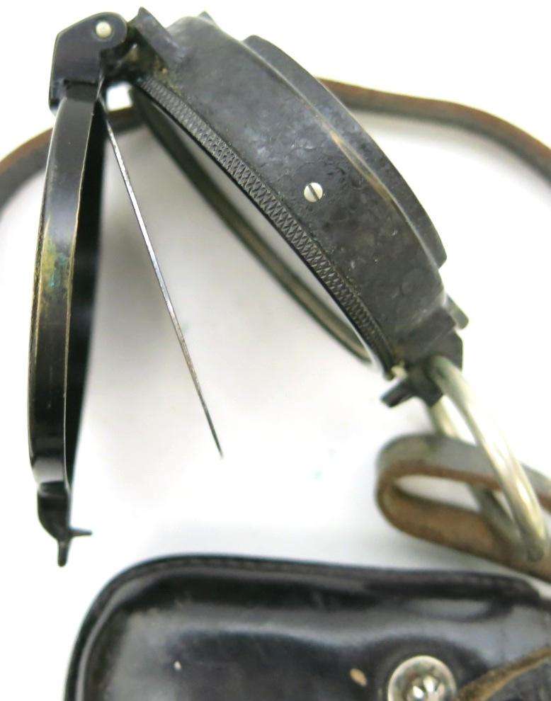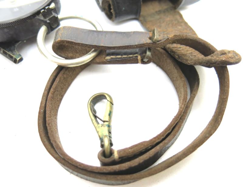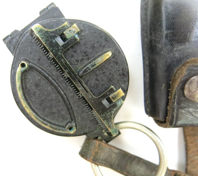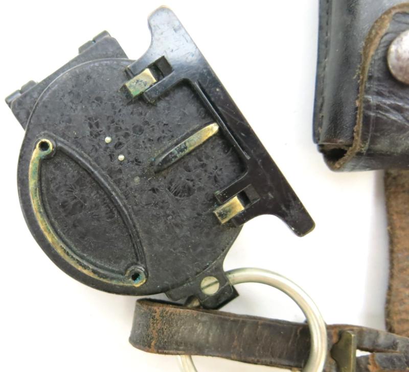 Excellent original set of an early brass made compass. I even didn´t want to remove the strap from the sheath for the photos, it is like this since the end of the war. The brass has the typical, (And nice, in my opinion), green patina when its in contact with leather for docens of years. The strap and pouch are not marked. These sets are more and more scarce every year.