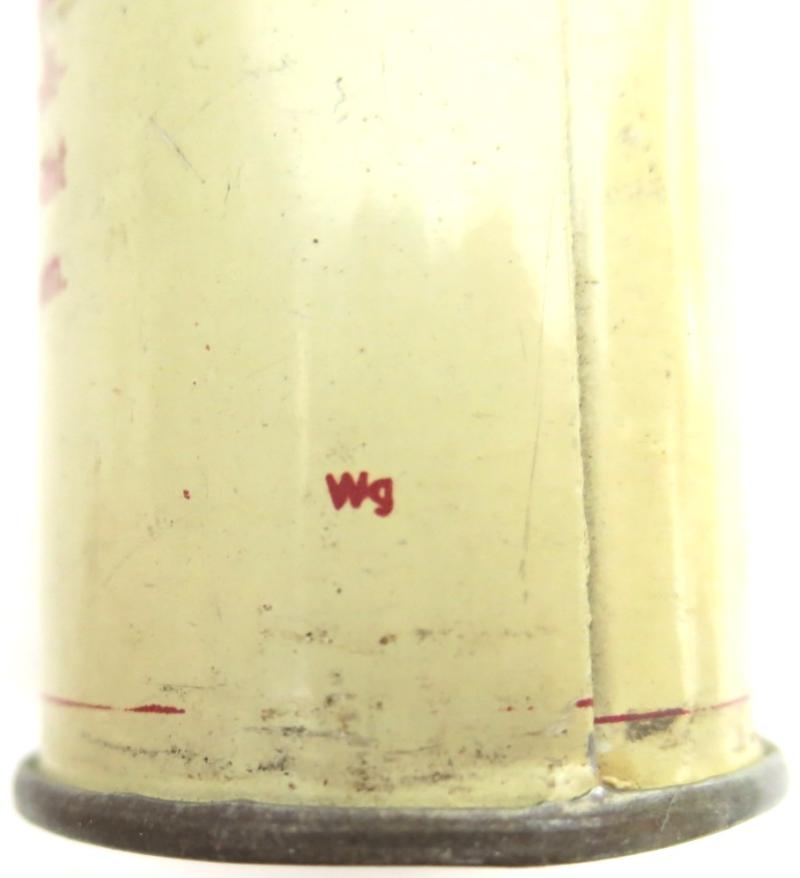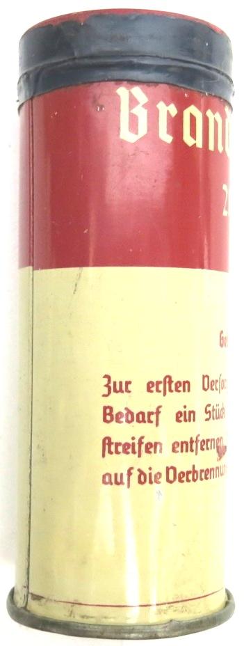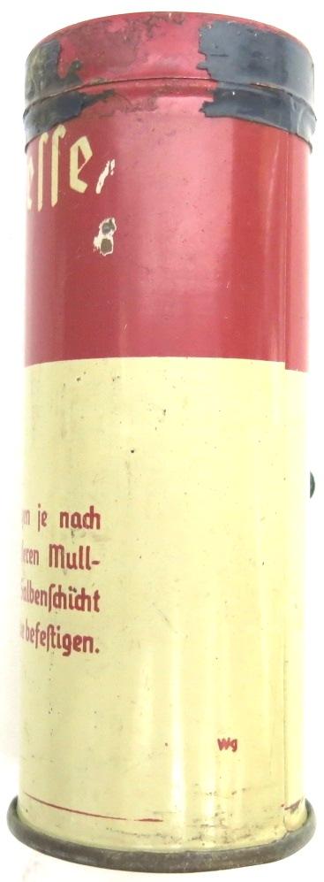 For fire wounds. The sealing tape is broken all around and the pot can be opened for see what it has inside, perfect for a nice display. The package still has the original ointment around after 80 years, unbelievable. These went into the Verbandkasten where you can read Brandbinde (Wismutbinde). These round pots were later introduced than the square ones in bare metal and named Brandbinde or Wismutbrandbinde. SO, you can use it for complete a Verbandkasten or a display or for collect them as themselves as I do.