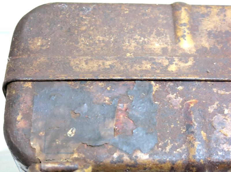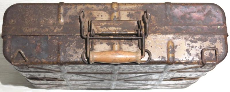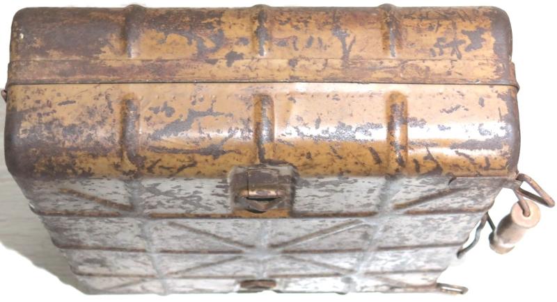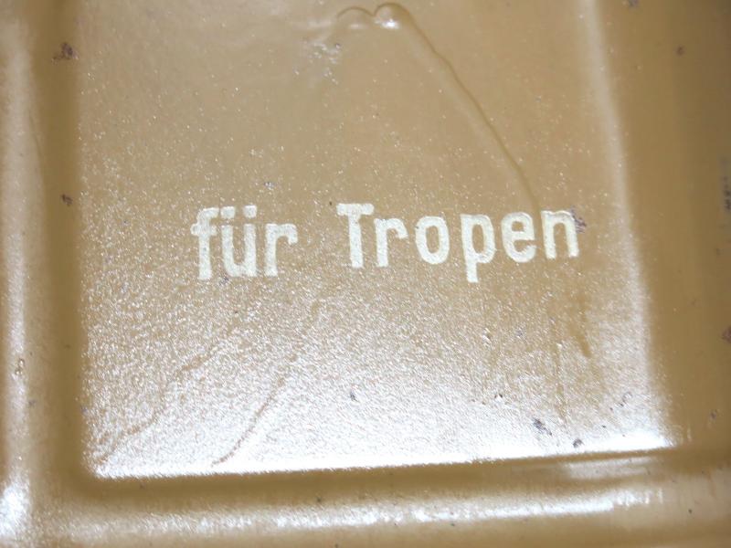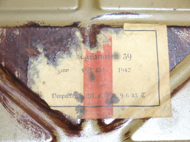 This is one of the hardest to find boxes: Steel cases, (In Feldgrau), for Egg Grenades have been always hard to find, already 25 years ago. But the Late War one in sand colour für Tropen.... This one has seen a lot of action on the outside, but inside it is nearly in pristine condition with a big part of the original label still in place. As I say, not an easy to find box. Imagine it in your display in opened position... Yes, great! And interesting to read that the packaging was made in 1943 with eggs made in 1942.